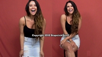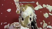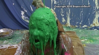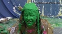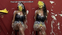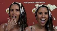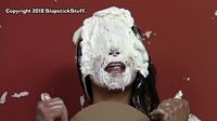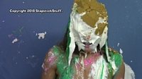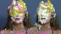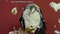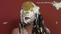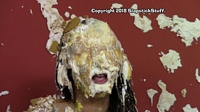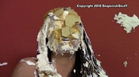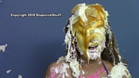 (She trips into cakes, slips and "accidentally" pies herself, and