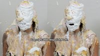 To summarize: Scene One is Bella's own bikini, which is both way too small and also shows off her cartoon character proportions nicely. This is the loosest skit, with lots of laughing, Bella thinking the scene is over early (twice), and her long-suffering boyfriend getting some nice pastry revenge. Scene Two finds Bella in pantyhose, heels, and a dress held in place by physics.... with some truly spectacular cakings, a nice dose of upskirt, and Bella throwing an empty pie crust at me while blinded by cream. (Which sums up the whole shoot perfectly.) And finally, Scene Three has Bella in see-through lingerie, playing a TV host whose pissed-off staff (no comment) takes sweet revenge on her.... culminating in a "revealing" ending that you don't wanna miss!