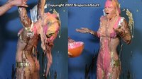 Scene 2 is a different take on "inequality" as Shelly takes on TWO roles! (And not for the first time either...) Super Shelly is the kind of oblivious superhero who shows up and makes everything way worse.... as our poor damsel discovers to the tune of "Super Sludge" chocolate slime, 13 messy pies, and even more slime! There's a reason why I didn't bother editing this one in 2014 (Spoiler: It took a ton of time...) but the final result is genuinely hilarious in a way that makes me happy. It also confirms that Shelly, while underappreciated, was one of the absolute greats: Not only did she get genuinely hogtied (in our most realistic bondage bit ever, even played for laughs) and then covered in mess, but she also found time to do her famous "Clumsy Bowl Gag" (TWICE!) for no real reason.... And all this after shooting the Super Shelly pick-ups... And she was still smiling and goofing around after all that!
