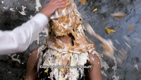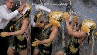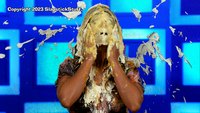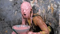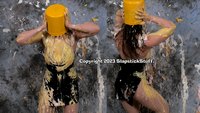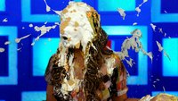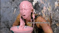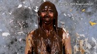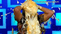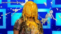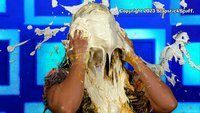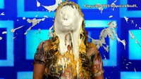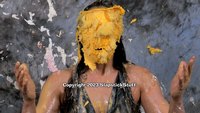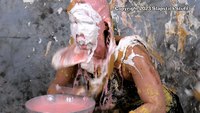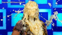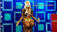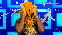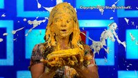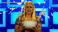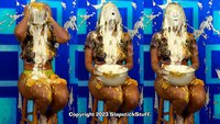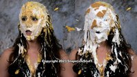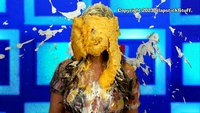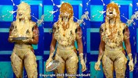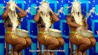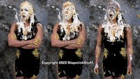 And then Scene Two finds Natalia back for more fun humiliation as she appears on the world's worst gameshow, It's Not Fair! A series of rigged contests finally culminates in "Take The Cake," as Natalia keeps missing incredible specific cake-related questions and finds her whole head buried under the mess of eight cakes in the face! (Yes, that's a single-scene record.) Incredible "angry" acting from Natalia, plus excellent leg/foot shots throughout... and even a few pies to break up the cake onslaught! But Natalia really came through with the final "head dunking in glop" game... as she basically kept covering herself in that sticky mess for ten minutes to give us an amazing (and unexpected) finale. That's why she's a legend! The final edit has all the bells & whistles (game-show backgrounds, sound FX, dumb music) while the unedited footage is just blue screen and Natalia being her usual amazing, down-for-anything self!